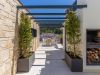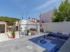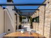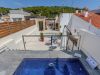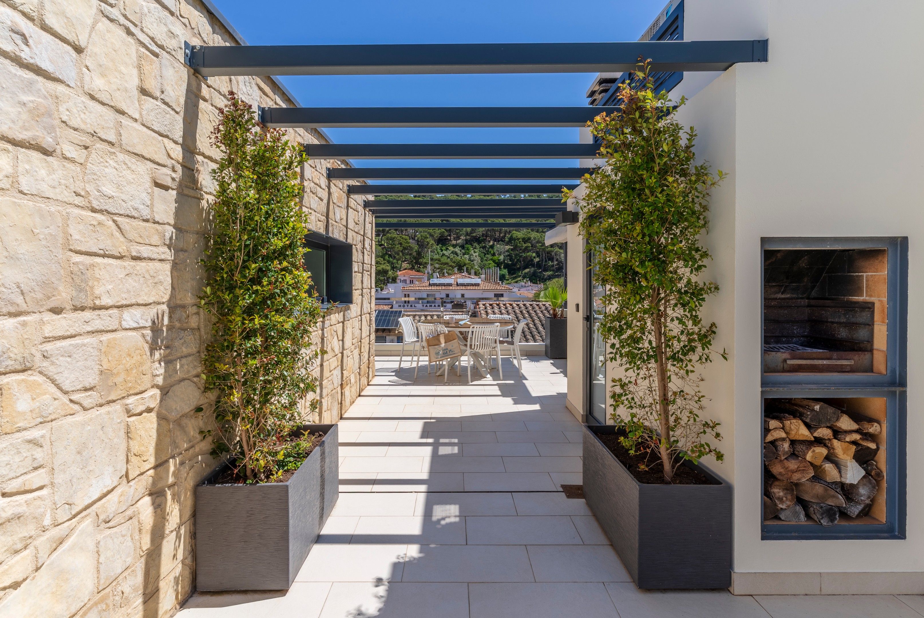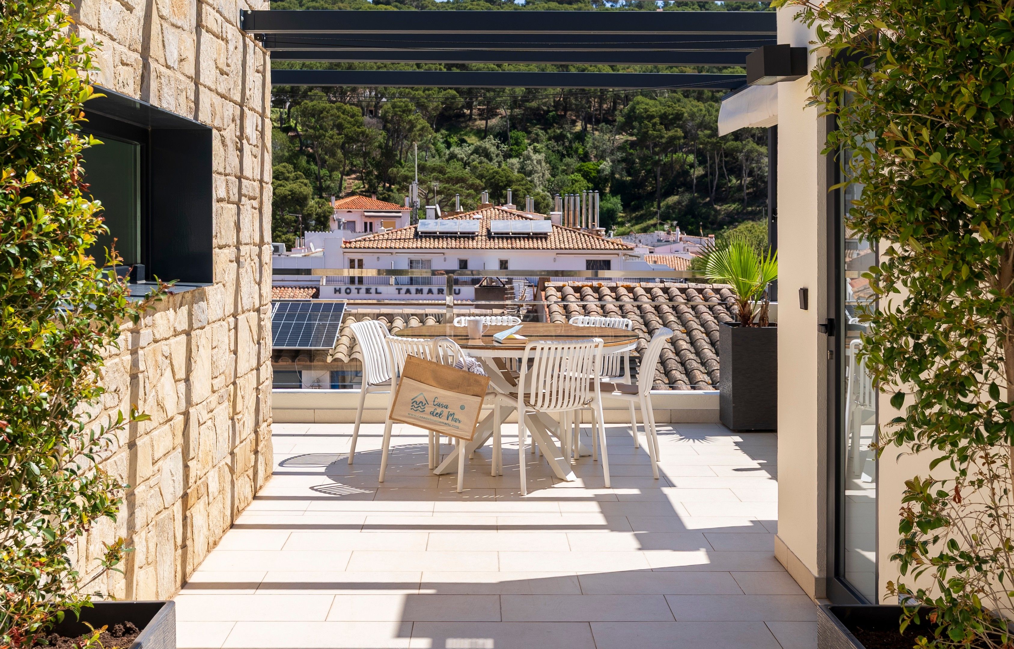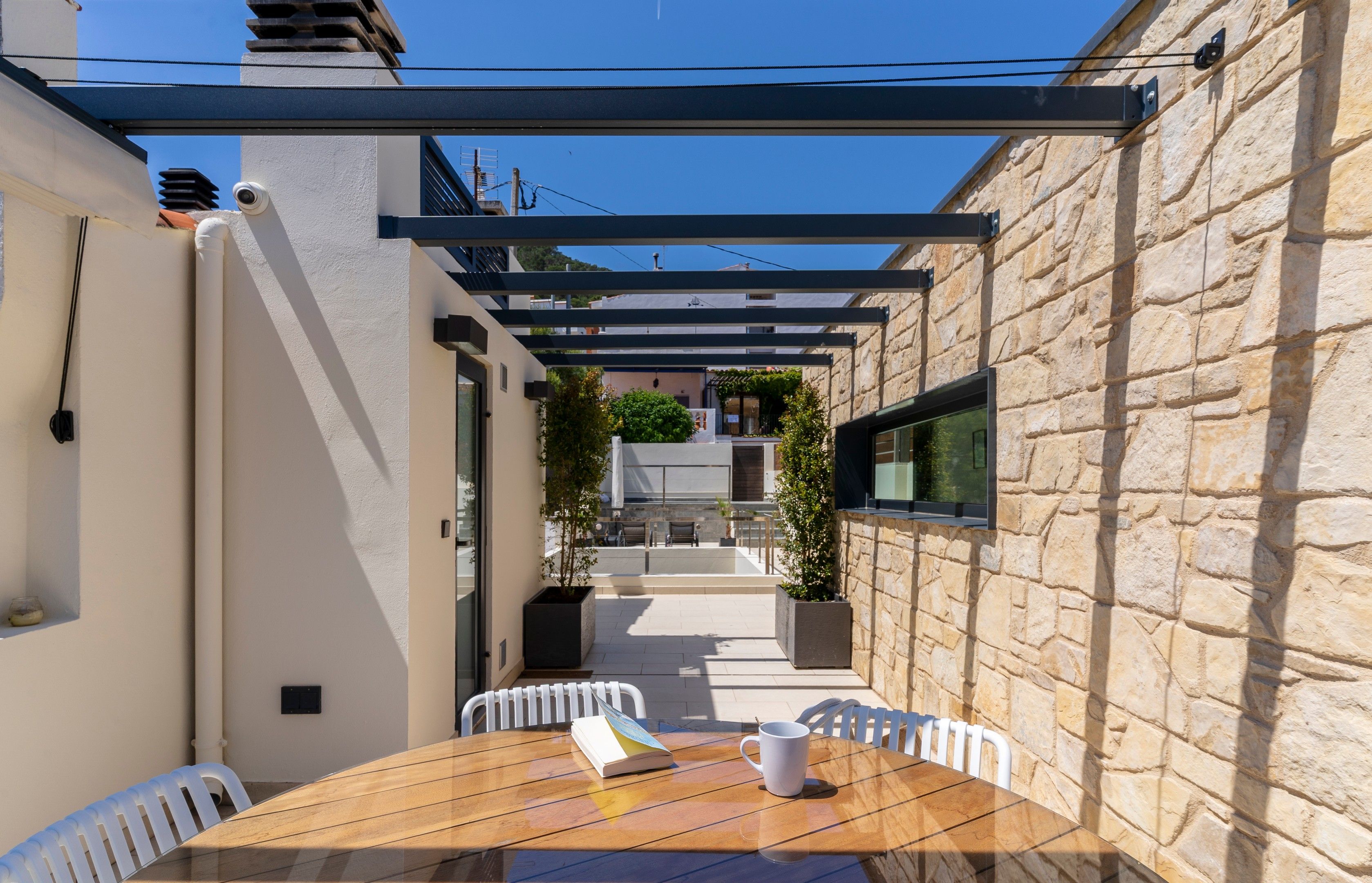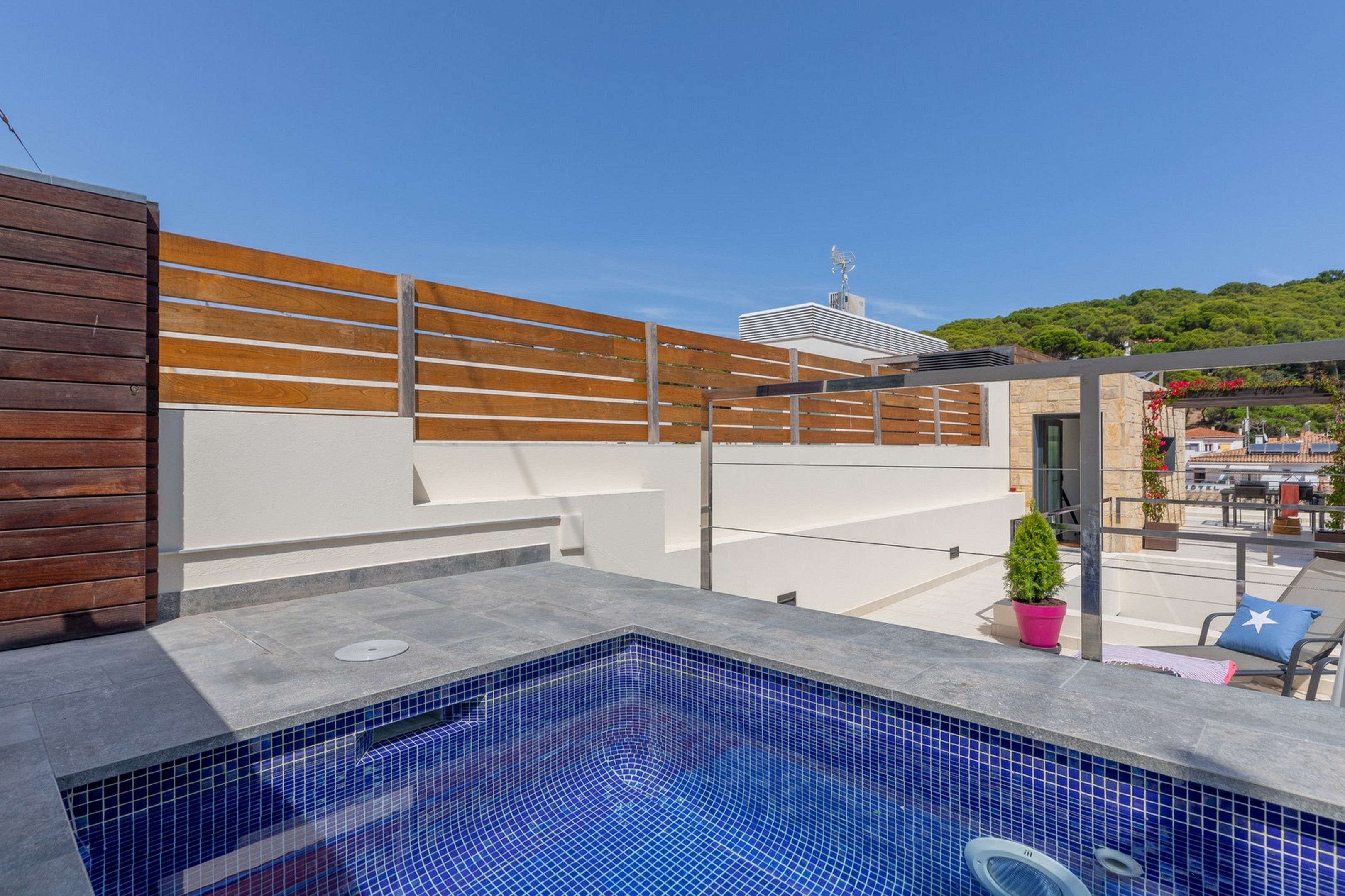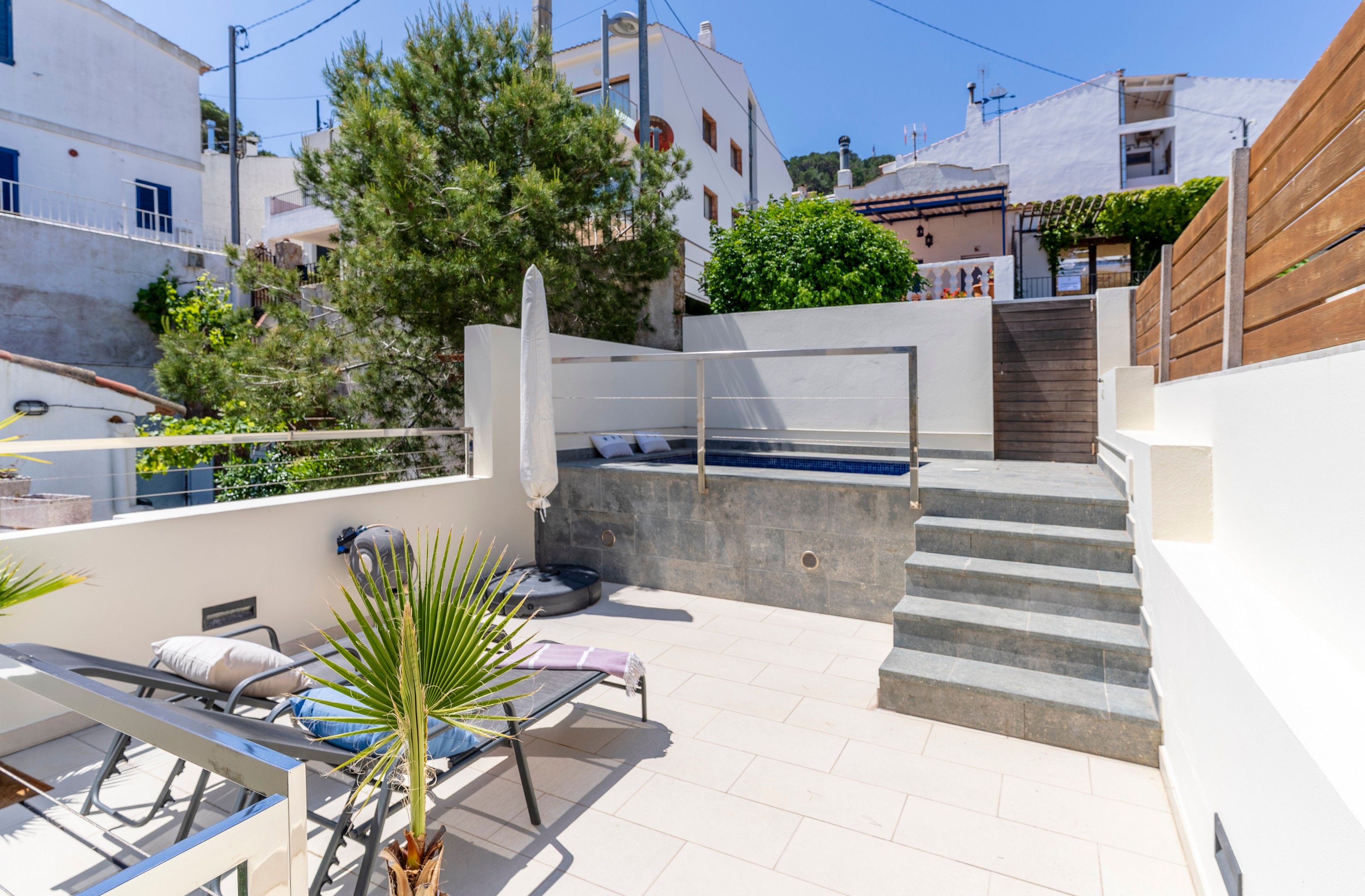 La part més utilitzada pels nostres hostes, intentant optimitzar al màxim trobareu una zona de bany amb una petita piscina còmode i accessible i una petita zona solàrium. A la altra banda trobem un petit bany, taula i cadires per a poder fer àpats o beure alguna cosa tranquilament mentres podem escoltar les onades del mar a més d’una petita barbacoa.
