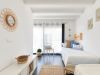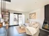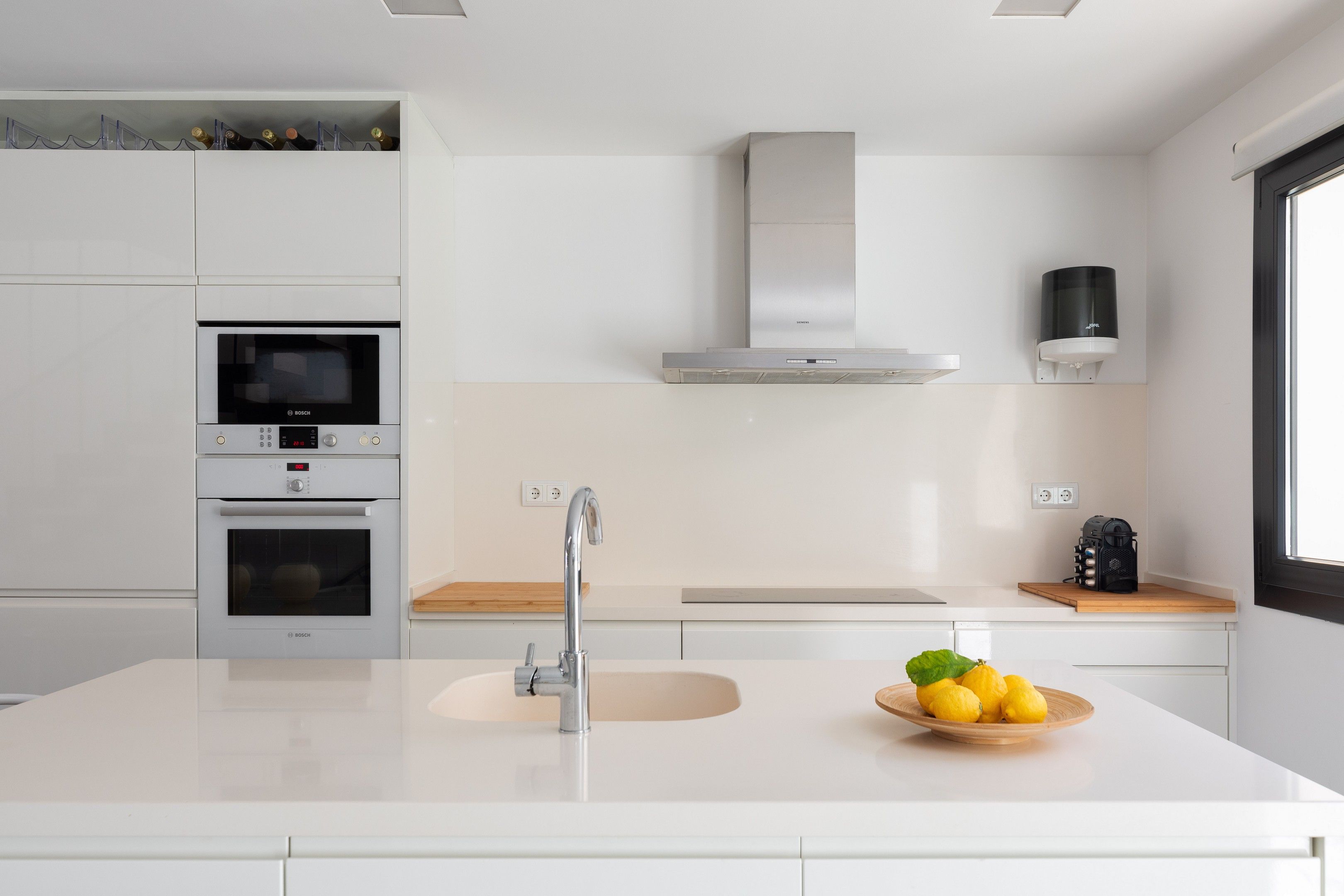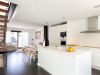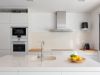 Cuina oberta totalment equipada amb una illa al mig, placa d’inducció, campana extractora, rentaplats integrat, forn, microones i nevera efecte mirall.
