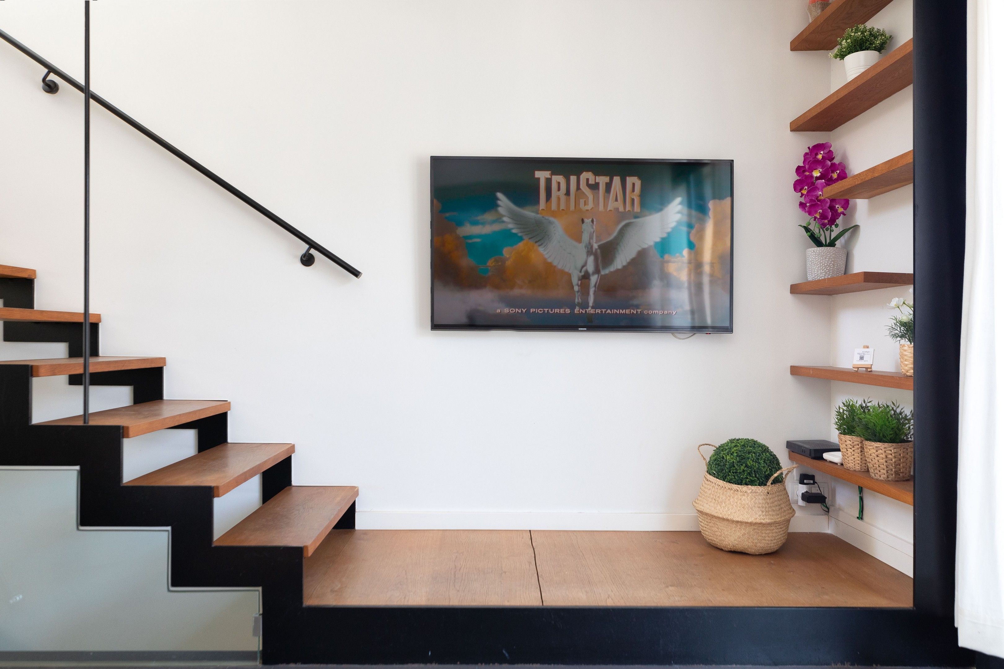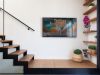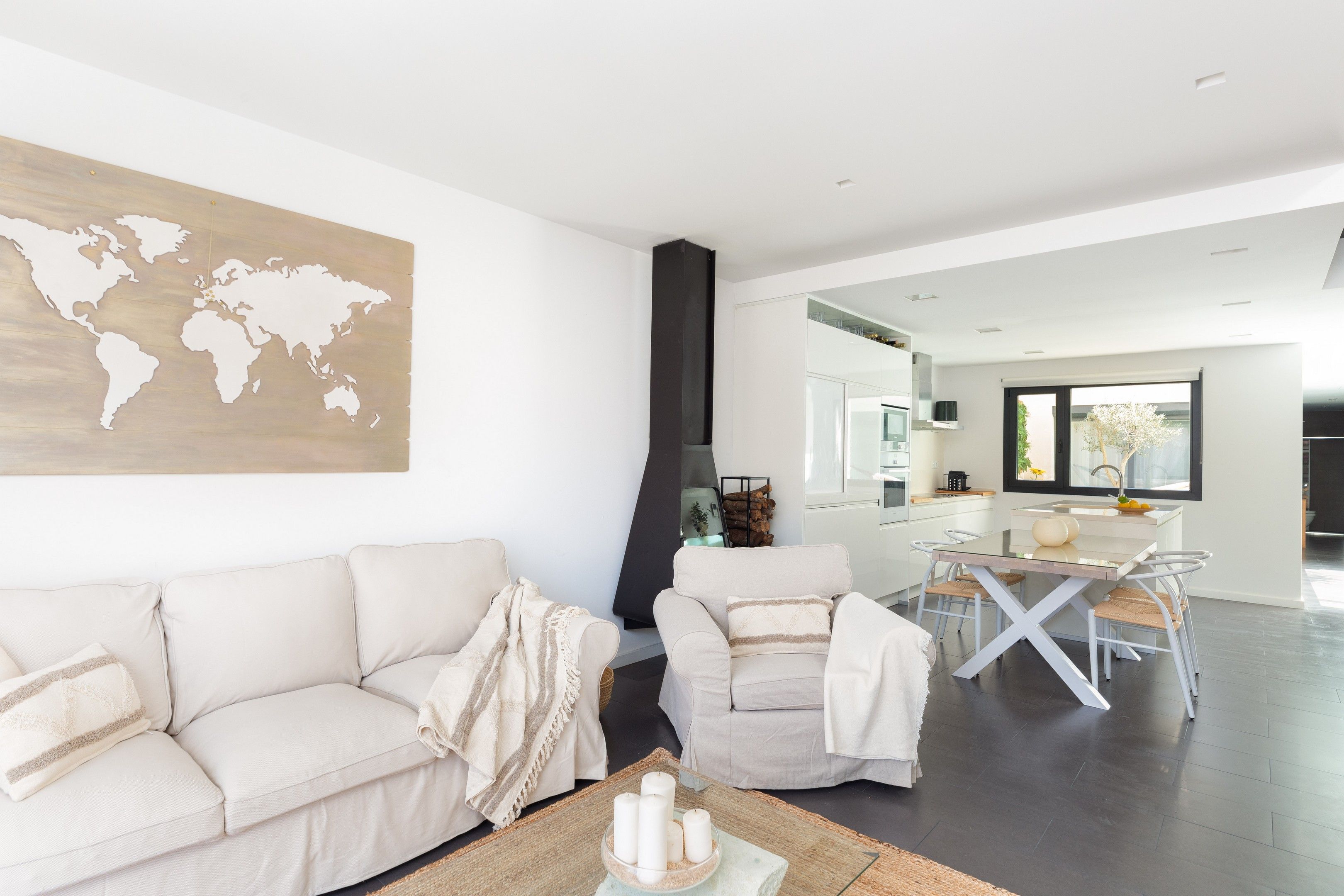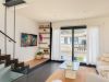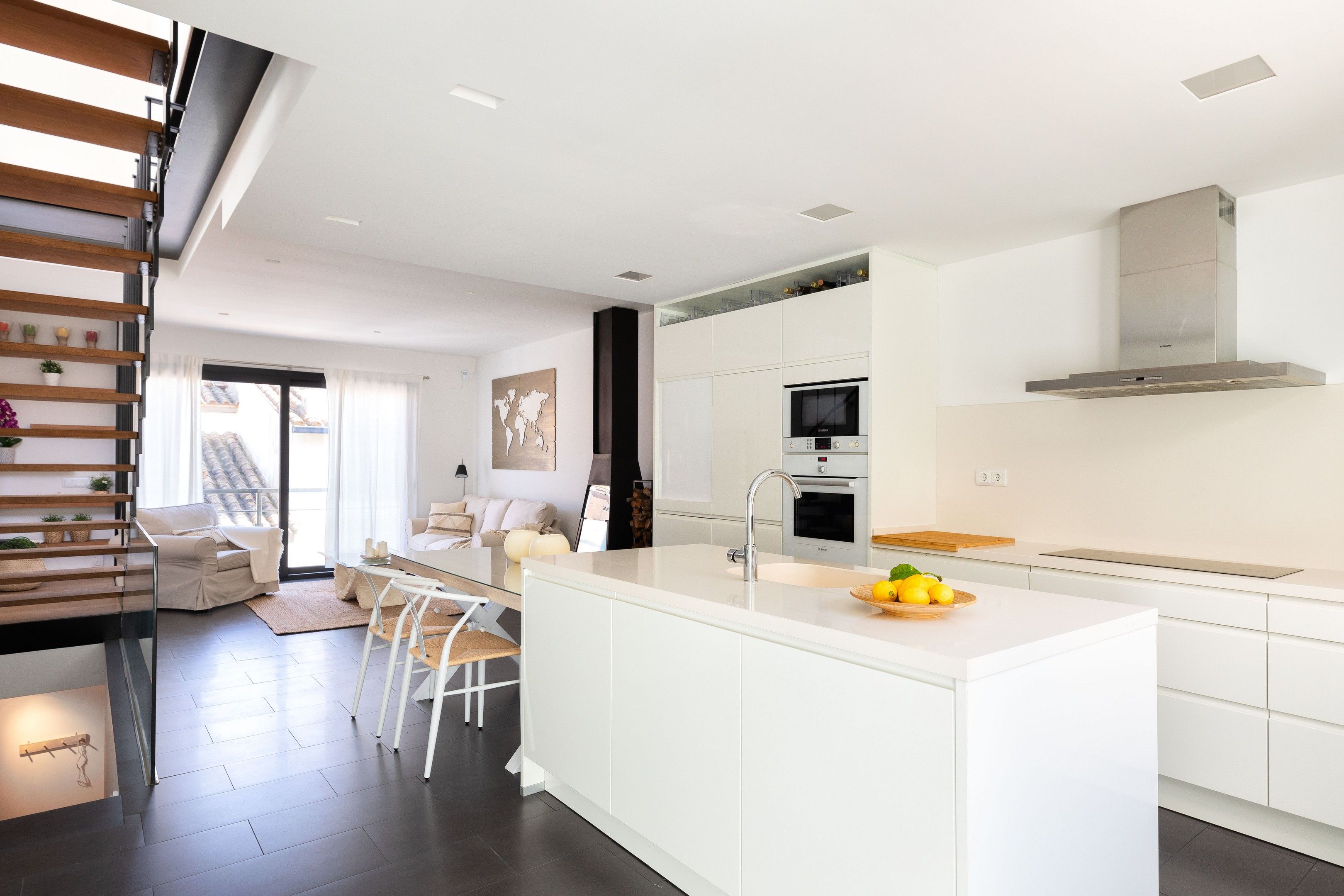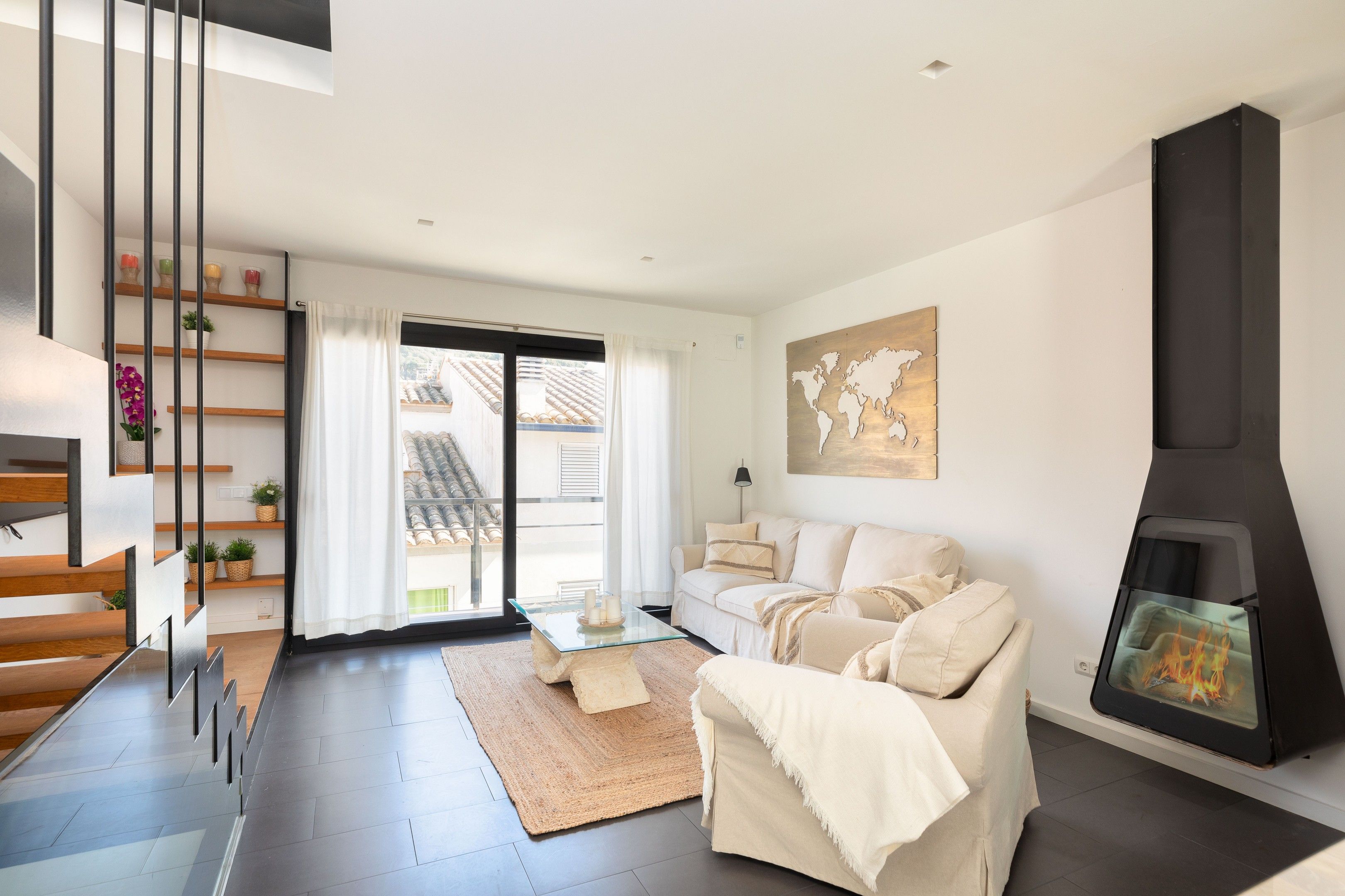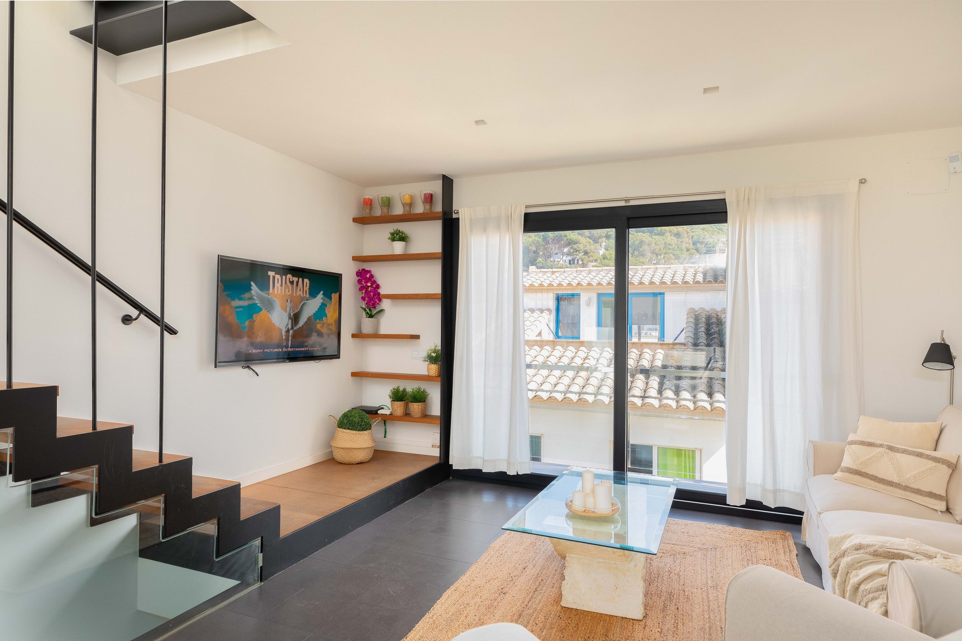 Compartint zona amb la cuina tenim una taula i cadires, sofà, butaca i Smart TV. Accés a balcó a la part davantera de la casa. Desde aquí podem accedir a la terrassa superior de la casa a través d’una bonica escala de ferro combinada amb escalons de roure.